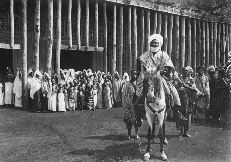Frédéric Gadmer, Le roi Njoya, sultan des Bamoun, à cheval, accompagné des dignitaires de la cour de justice, sort du quartier royal de la ville, Foumban, Région de l'Ouest, Cameroun, 1917.05.24